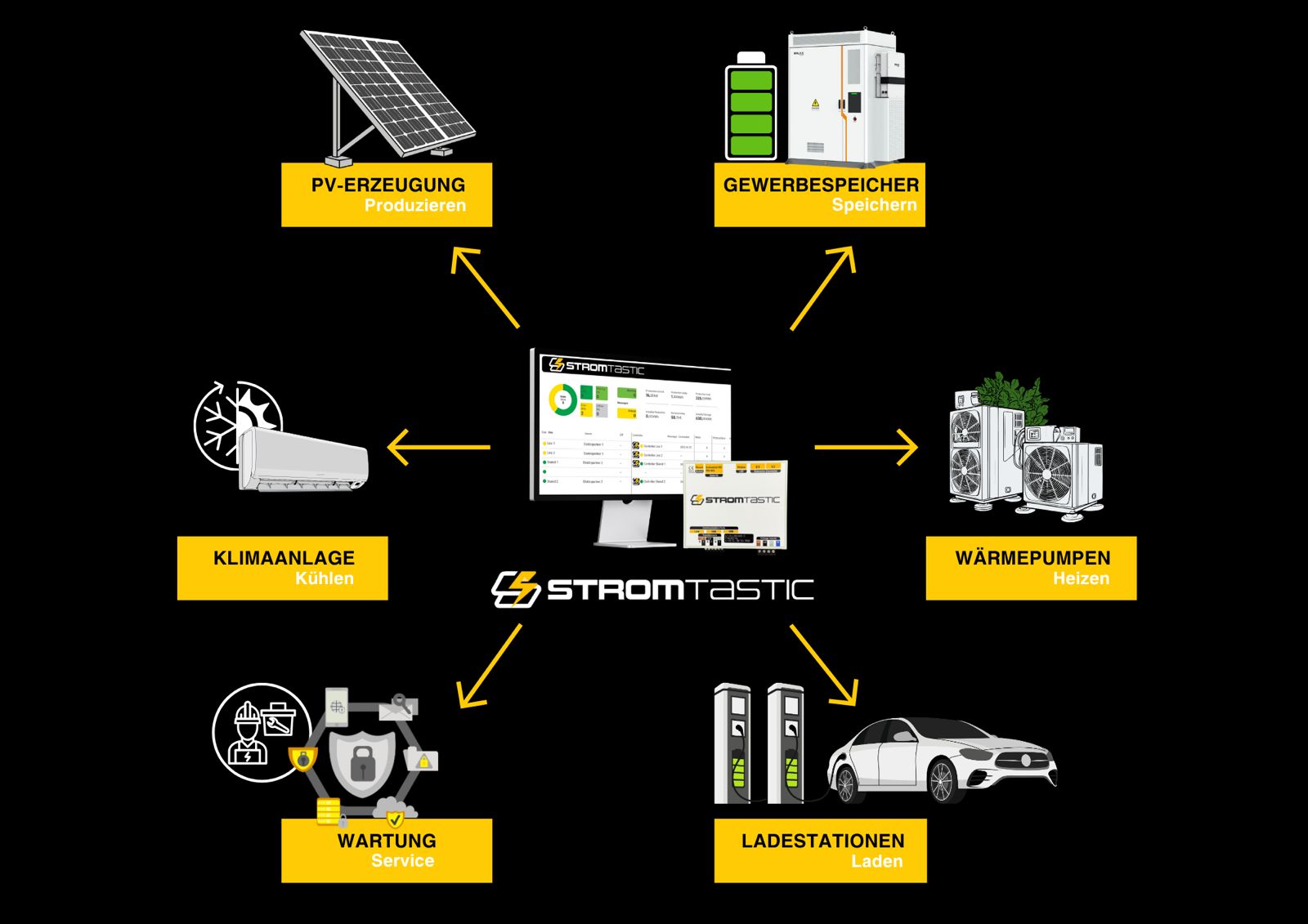Wir von Stromtastic GmbH entwickeln ganzheitliche Energielösungen für Produktion, Speicherung, Laden, Heizen und Kühlen. Mit unserer intelligenten Softwareplattform arbeiten wir herstellerunabhängig – so bleibt Ihre Lösung flexibel und zukunftssicher.